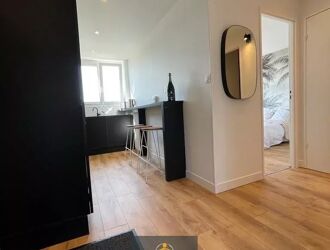 Cet appartement offre un grand salon séjour lumineux, ouvert à la fois sur la cuisine aménagée et sur le couloir, créant un espace de vie convivial et parfaitement fluide.